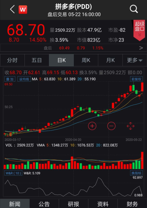 而拼多多在中概股齐跌之时一度逆势上涨15.35%,收涨14.5%,市值暴涨百亿美金,目前拼多多的市值已突破800亿美金,两月内股价已经翻倍。