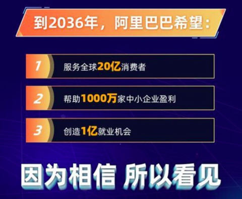 阿里还为自己定下了2036年实现服务20亿消费者、帮助1000万中小企业实现盈利、创造1亿就业机会的目标。